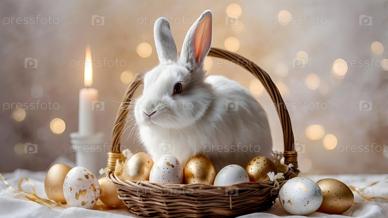 Концепция яркого пасхального праздника. Нежные пасхальные яйца, кролик и нежные цветы на пастельном акварельном фоне с нежными венами