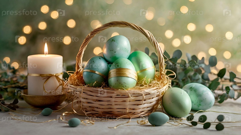 Концепция яркого пасхального праздника. Нежные пасхальные яйца в корзине и зеленые ветви эвкалипта на пастельном акварельном фоне с нежными венами