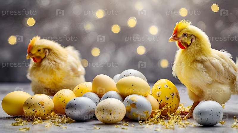 Концепция яркого пасхального праздника. Нежные пасхальные яйца, желтые куры, курица и цветы нарциссов на пастельном акварельном фоне с нежными венами