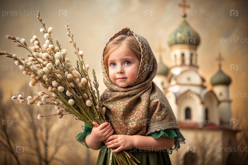 Вербное воскресенье. Христианство. Портрет трехлетней девочки в русской народной шали с ивовыми ветвями в руках на фоне православного храма