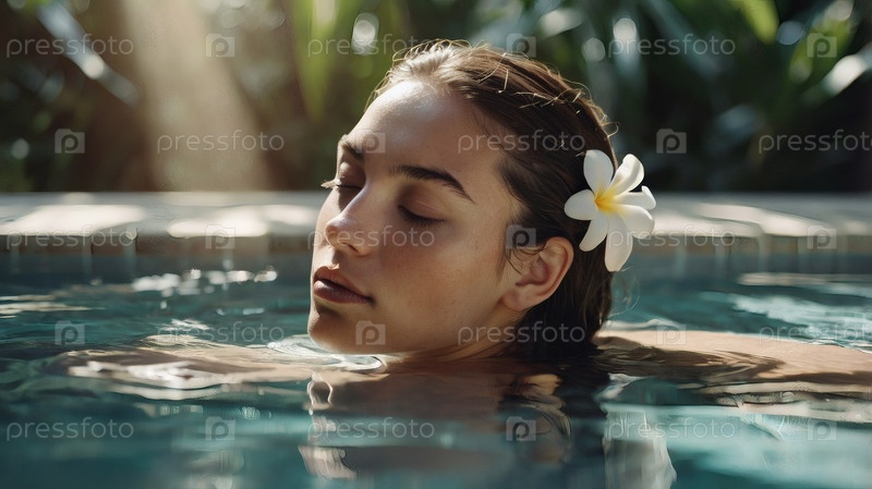 Близко. Молодая красивая женщина в бирюзовом бассейне. Концепция здорового образа жизни, релаксации, релаксации, туризма, косметических спа-процедур в спа-салоне красоты, самолюбия