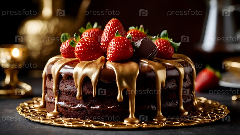 Концепция праздничных блюд. Пекарня. Красивый вкусный торт со свежей клубникой и шоколадом на столе. День рождения и сладости
