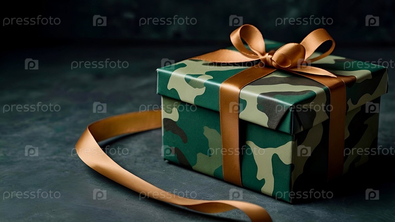 Концепция Дня защитника Отечества 23 февраля. Подарок камуфляжной коробки с праздничным атласным ленточным луком на темно-зеленом фоне