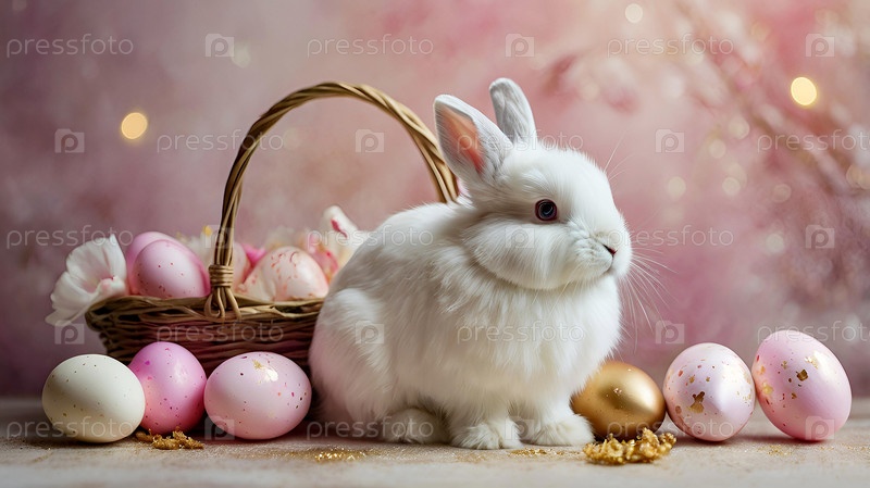 Концепция яркого пасхального праздника. Нежные пасхальные яйца, белый кролик и нежные цветы тюльпанов на пастельном акварельном фоне с нежными венами