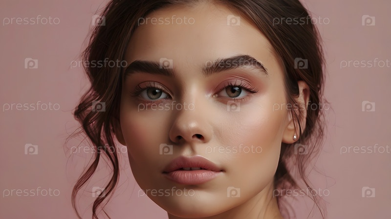 Красивый портрет естественной девушки на нейтрально-розовом фоне. Косметология, уход за кожей, уход за лицом и макияж