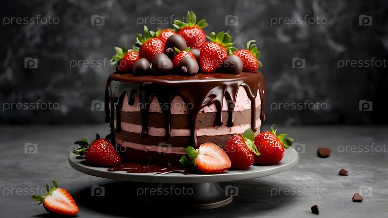 Концепция праздничных блюд. Пекарня. Красивый вкусный торт со свежей клубникой и шоколадом на столе. День рождения и сладости