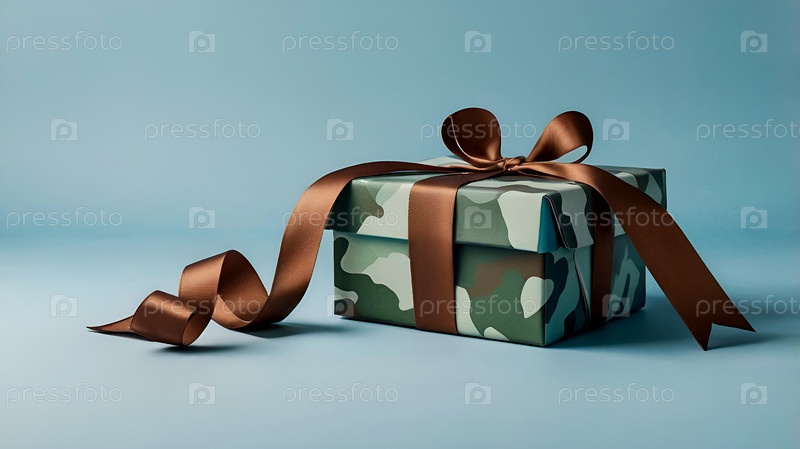 Концепция Дня защитника Отечества 23 февраля. Подарочная камуфляжная коробка с праздничным атласным ленточным луком на светло-синем фоне