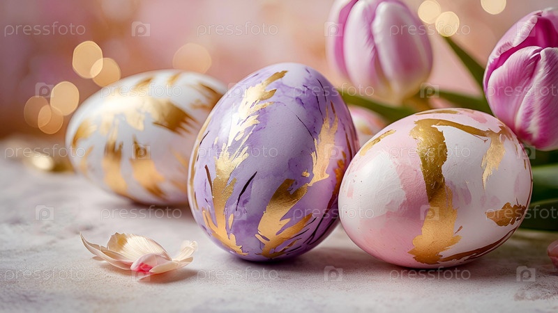 Концепция яркого пасхального праздника. Нежные пасхальные яйца в розовых, золотых и фиолетовых тонах и цветы тюльпанов на пастельном акварельном фоне с нежными венами