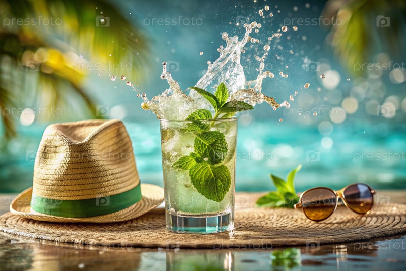 Бокал вкусного коктейля Mojito на фоне бассейна. Алкогольный коктейль сочные фрукты с кубиками льда и ломтиками лимона, лайма и мяты