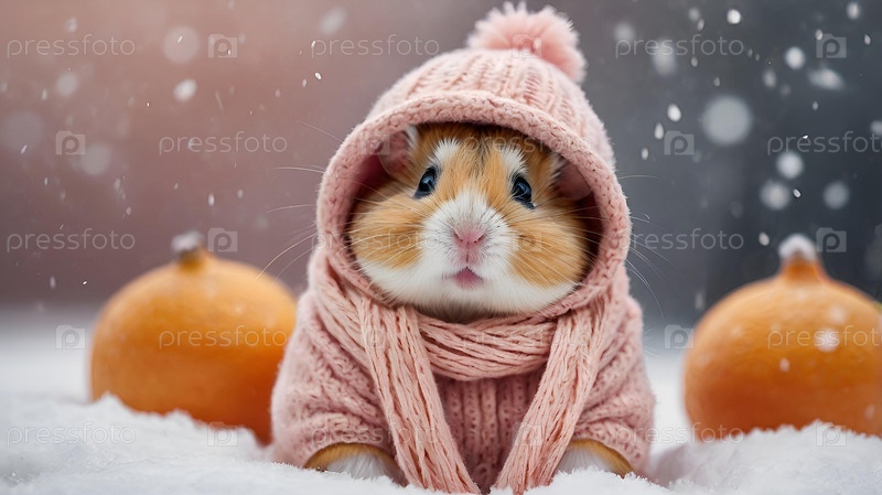 Забавный хомяк с большими щеками, одетый в уютную мягкую розовую теплую одежду, шляпу и шарф на зимнюю тему. Сезонные обои