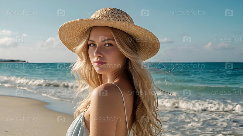 Летний отдых на пляже, крупный план красивой женщины в соломенной шляпе. Летнее время. Отдых и каникулы, место для копирования