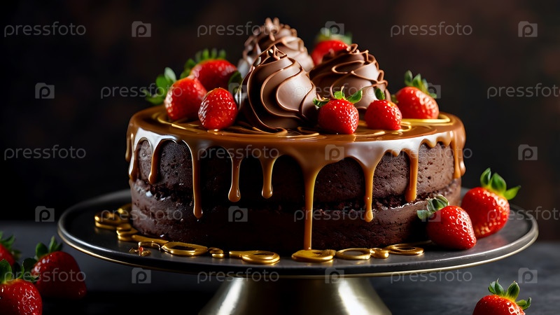 Концепция праздничных блюд. Пекарня. Красивый вкусный торт со свежей клубникой и шоколадом на столе. День рождения и сладости