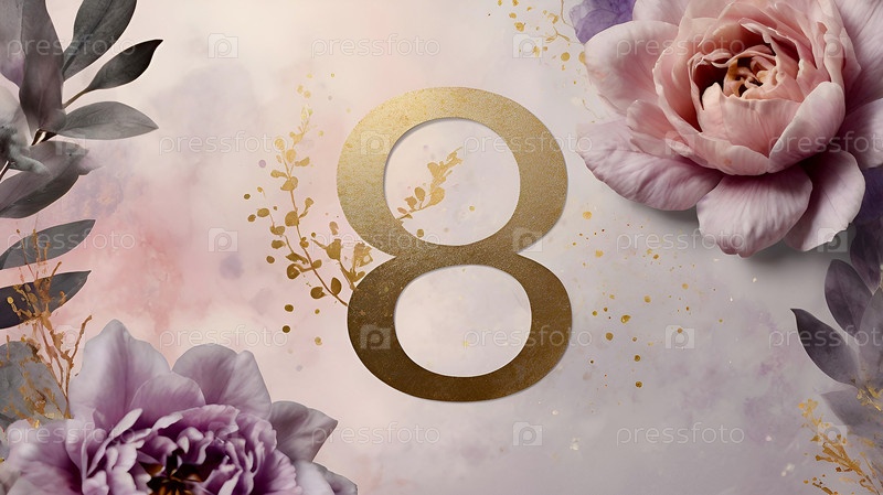 Международный женский день. Праздник приходится на 8 марта. Баннер, флаер. Праздничный цветочный фон с номером 8