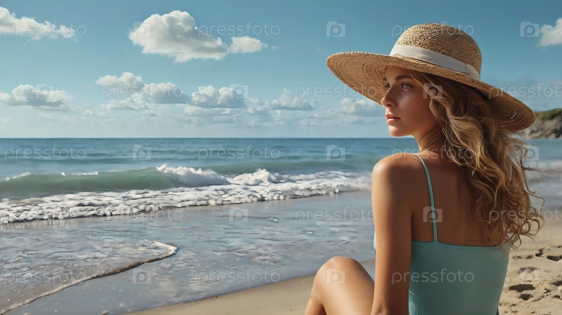 Женщина на отдыхе, сидящая в купальнике и широкополой соломенной шляпе на пляже в солнечный день и глядящая на море