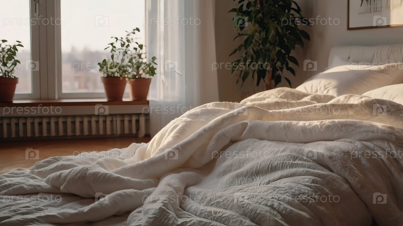 Интерьер современного дома. Минималистичный уютный бежевый интерьер спальни с клеткой, подушками, изголовьем, льняным полотном и прикроватным столом