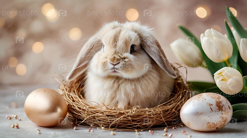 Концепция яркого пасхального праздника. Нежные пасхальные перламутровые яйца в корзине, кролик и нежные цветы на пастельном акварельном фоне