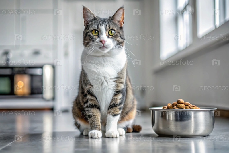 Симпатичная кошка возле миски для кормления на белой кухне. Кошка смотрит в камеру. Забота о животных