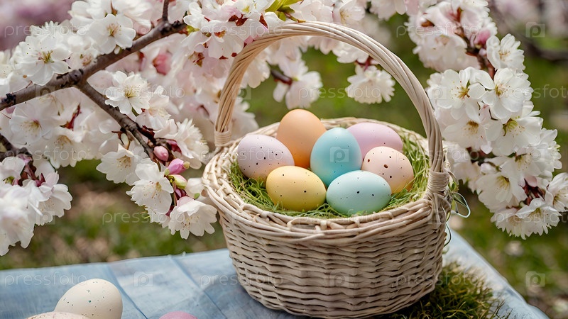 Концепция яркого пасхального праздника. Красивый фон с пасхальными яйцами в плетеной корзине и весенними цветами вишни