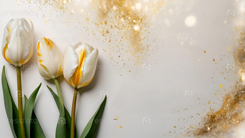 Тюльпаны — весенние цветы. Красивый цветочный фон с красивым эффектом боке. Тюльпановые почки на белом акварельном фоне с золотыми жилками