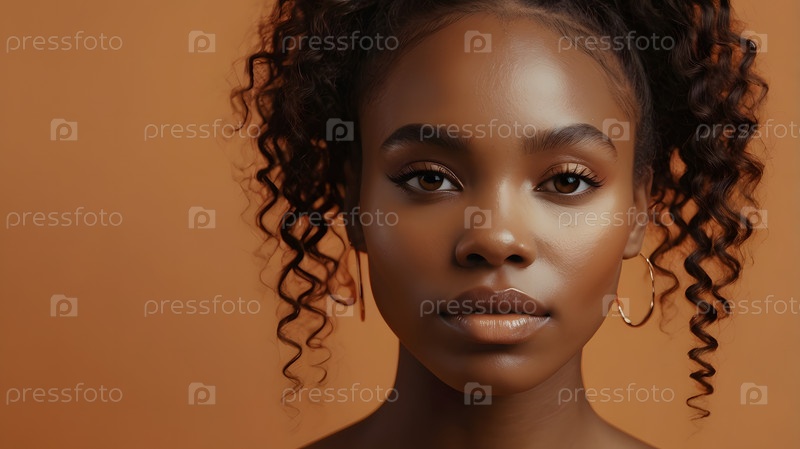 Красивый портрет чернокожей девушки на нейтрально-оранжевом фоне. Косметология, уход за кожей, уход за лицом и макияж