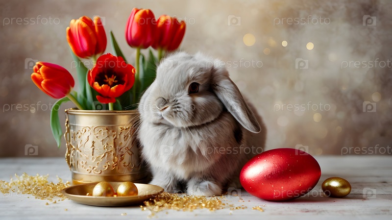 Концепция яркого пасхального праздника. Яркие пасхальные яйца в плетеной корзине, кролик и ярко-красные цветы на пастельно-водяном фоне
