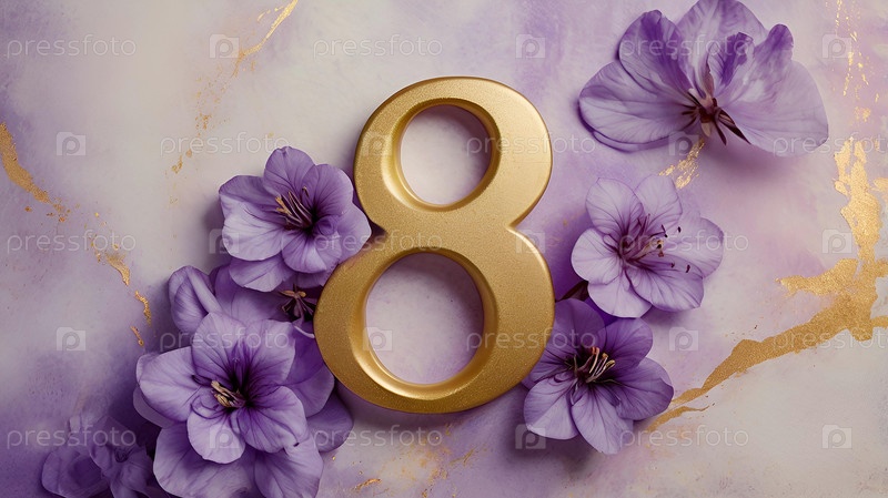 Международный женский день. Праздник приходится на 8 марта. Баннер, флаер. Праздничный, нежный фиолетовый цветочный фон с номером 8