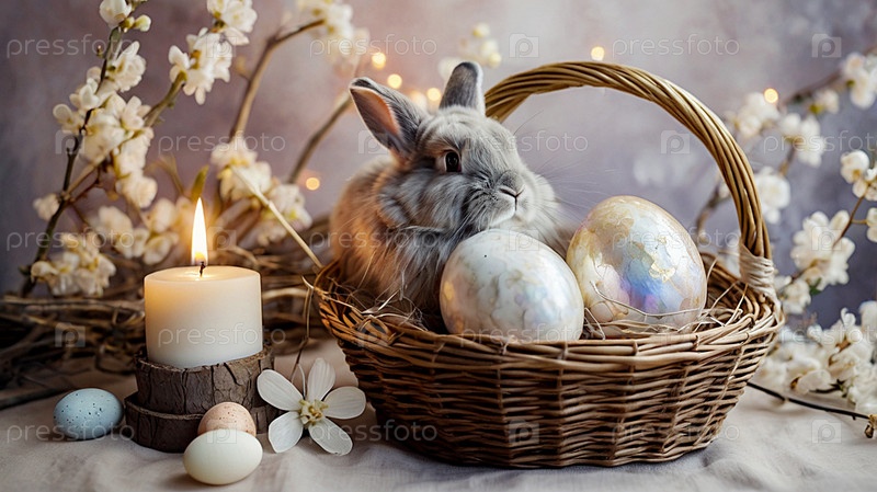 Концепция яркого пасхального праздника. Нежные пасхальные перламутровые яйца в корзине, кролик и нежные цветы на пастельном акварельном фоне
