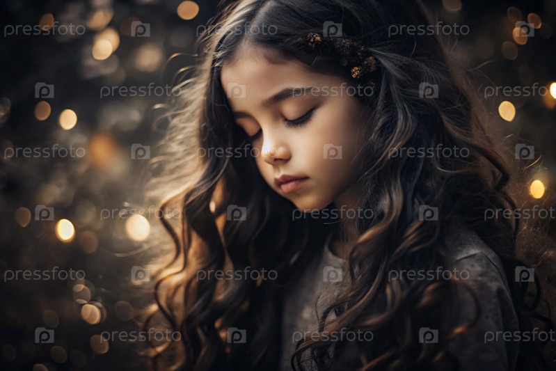 Портрет красивой маленькой брюнетки с длинными волнистыми волосами и задумчивым взглядом. Волосы развиваются и создают ощущение легкости и естественности