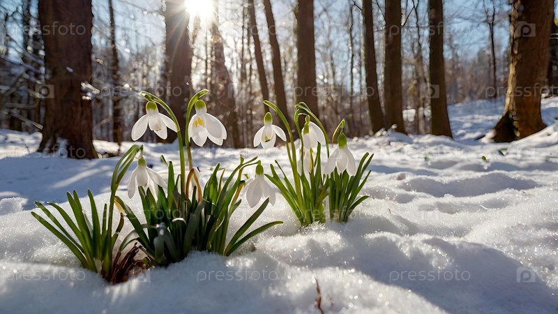 Первые весенние цветы. Белые снегопады в лесу крупным планом на утреннем солнце. Весеннее время