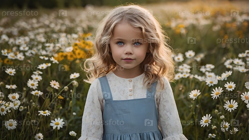 Всероссийский день семьи, любви, верности. Красивая маленькая кудрявая девочка на фоне поля ромашек. День Святого Валентина Петра и Февронии