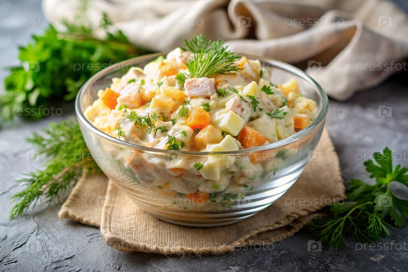 Традиционный русский салат Оливье для застолья на тарелке на деревянной столешнице. генеративный ИИ