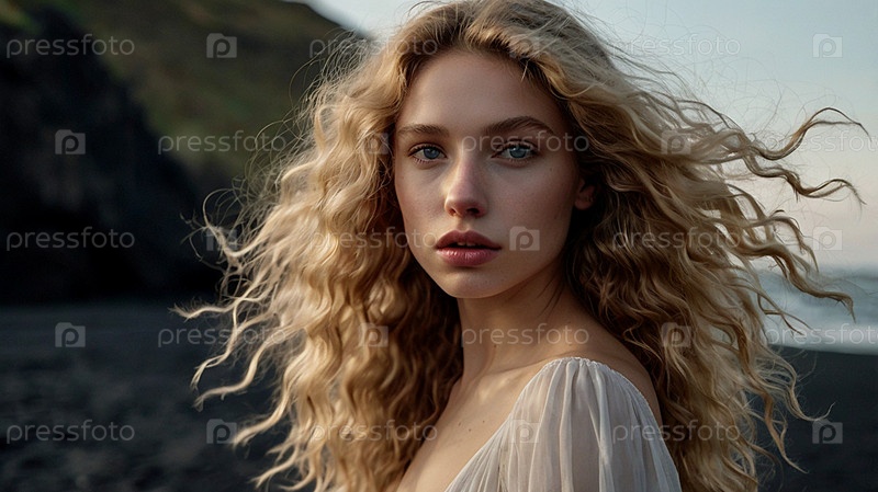 Портрет красивой женщины на пляже с черным песком на фоне моря. Романтическая, спокойная и чувственная фотография девушки в нежном платье