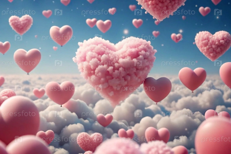 Знамение на День святого Валентина. Абстрактный фон. Красивые нежные розовые сердца в облаках