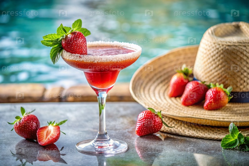Бокал вкусной клубничной маргариты и клубничный коктейль на фоне бассейна. Алкогольный коктейль сочный фруктово-голубой с кубиками льда, клубникой и мятой