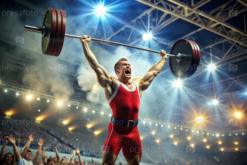 Соревнования по тяжелой атлетике. Спортсмен принимает большой вес штанги. Спорт летних Олимпийских игр