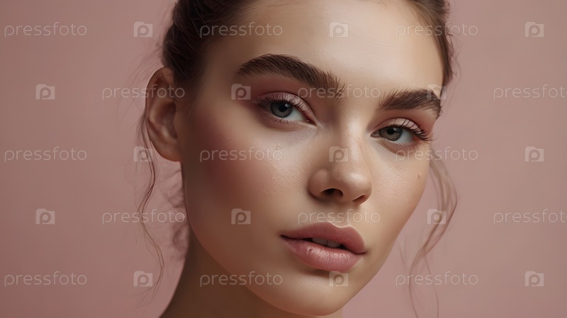 Красивый портрет естественной девушки на нейтрально-розовом фоне. Косметология, уход за кожей, уход за лицом и макияж