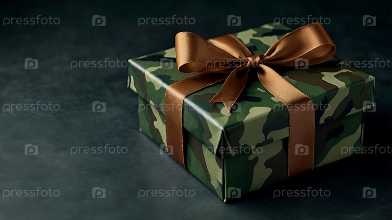 Концепция Дня защитника Отечества 23 февраля. Подарок камуфляжной коробки с праздничным атласным ленточным луком на темно-зеленом фоне