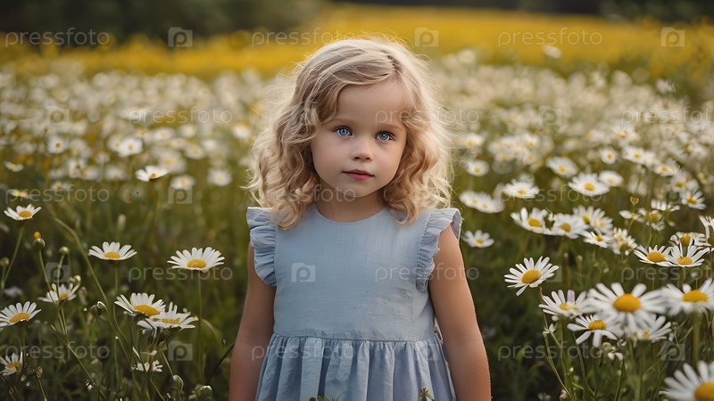 Всероссийский день семьи, любви, верности. Красивая маленькая кудрявая девочка на фоне поля ромашек. День Святого Валентина Петра и Февронии