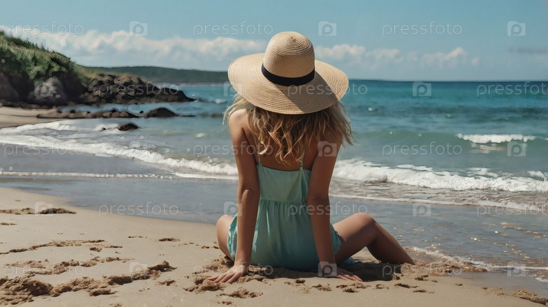 Женщина на отдыхе, сидящая в купальнике и широкополой соломенной шляпе на пляже в солнечный день и глядящая на море