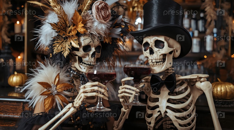 Пара любителей скелетов с коктейлями в баре. Вечеринка в честь Хэллоуина или Дня мертвых
