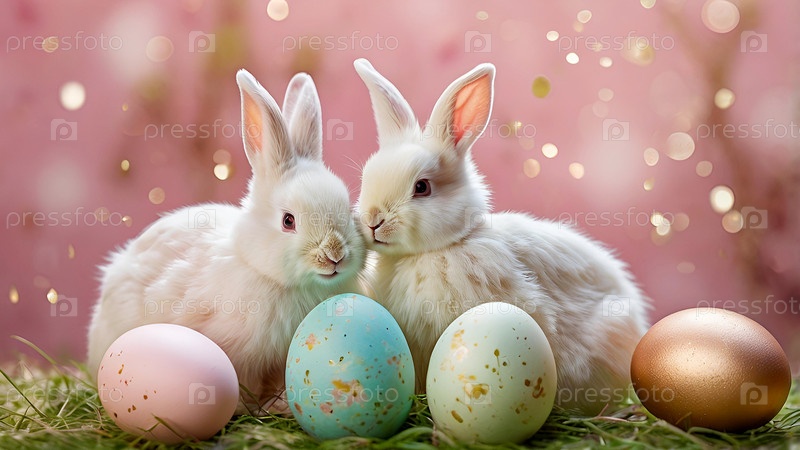 Концепция яркого пасхального праздника. Нежные пасхальные яйца, кролики на пастельном фоне