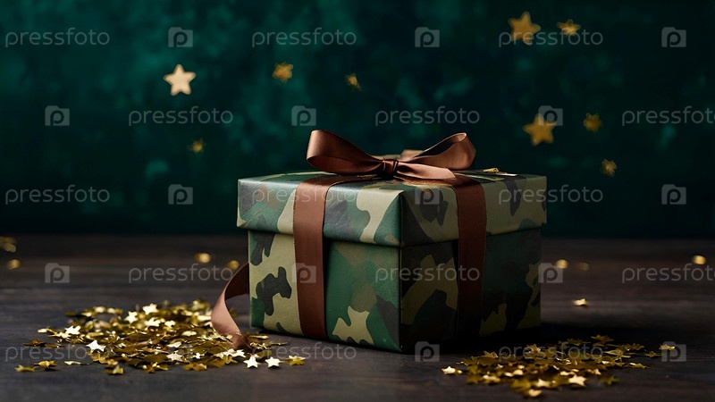 Концепция Дня защитника Отечества 23 февраля. Подарок камуфляжной коробки с праздничным атласным ленточным луком на темно-зеленом фоне