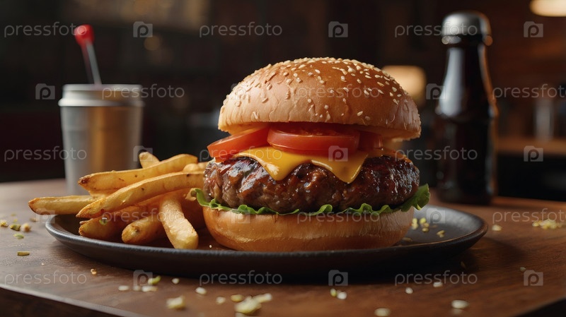 Завершение сочного говяжьего гамбургера, картошки фри и стакана пива. Концепция быстрого питания и быстрого питания