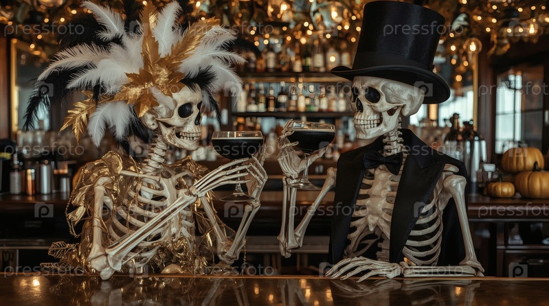 Пара любителей скелетов с коктейлями в баре. Вечеринка в честь Хэллоуина или Дня мертвых