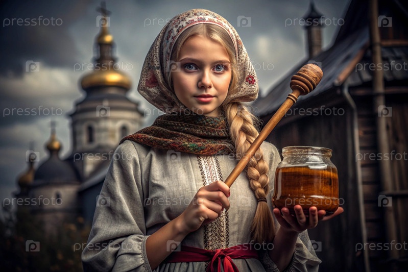 Концепция русского православного праздника Медовый Спаситель. Красивая маленькая девочка в русской национальной одежде и шарф с банкой меда на фоне православной церкви
