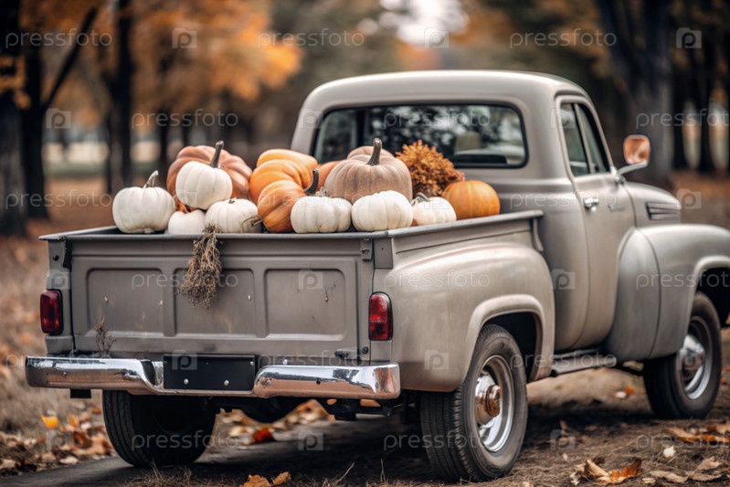 Осень, осенний дизайн. Большой урожай тыкв на заднем сиденье ретро-пикапа, крупным планом