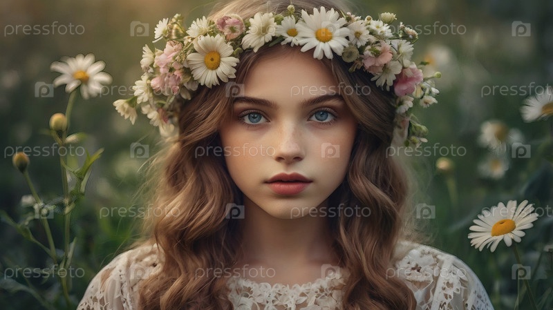 Красивая девушка с венком из ромашек и кукурузных цветов на голове в поле. День святых Петра и Февронии. Всероссийский день семьи, любви, верности