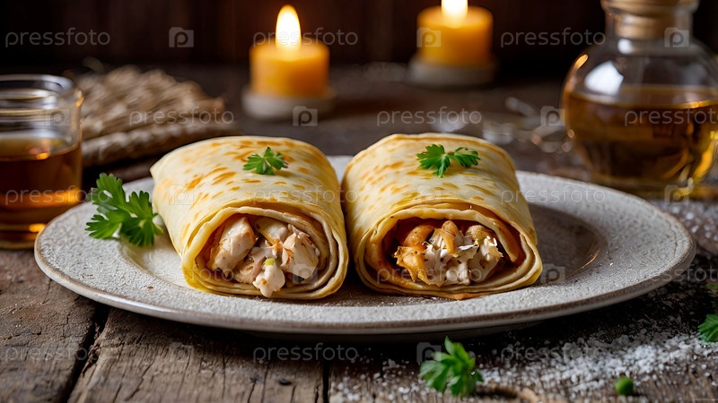 Русские традиции. Российский праздник Масленица. Натюрморт с блинами с мясом