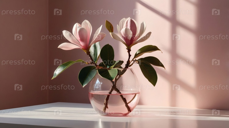 Элегантная магнолия цветет на ветке в стеклянной вазе на розовом фоне с контрастным солнечным светом. Нежные цветы с розовыми оттенками. Деревенская ветвь