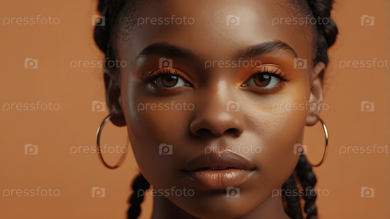 Красивый портрет чернокожей девушки на нейтрально-оранжевом фоне. Косметология, уход за кожей, уход за лицом и макияж